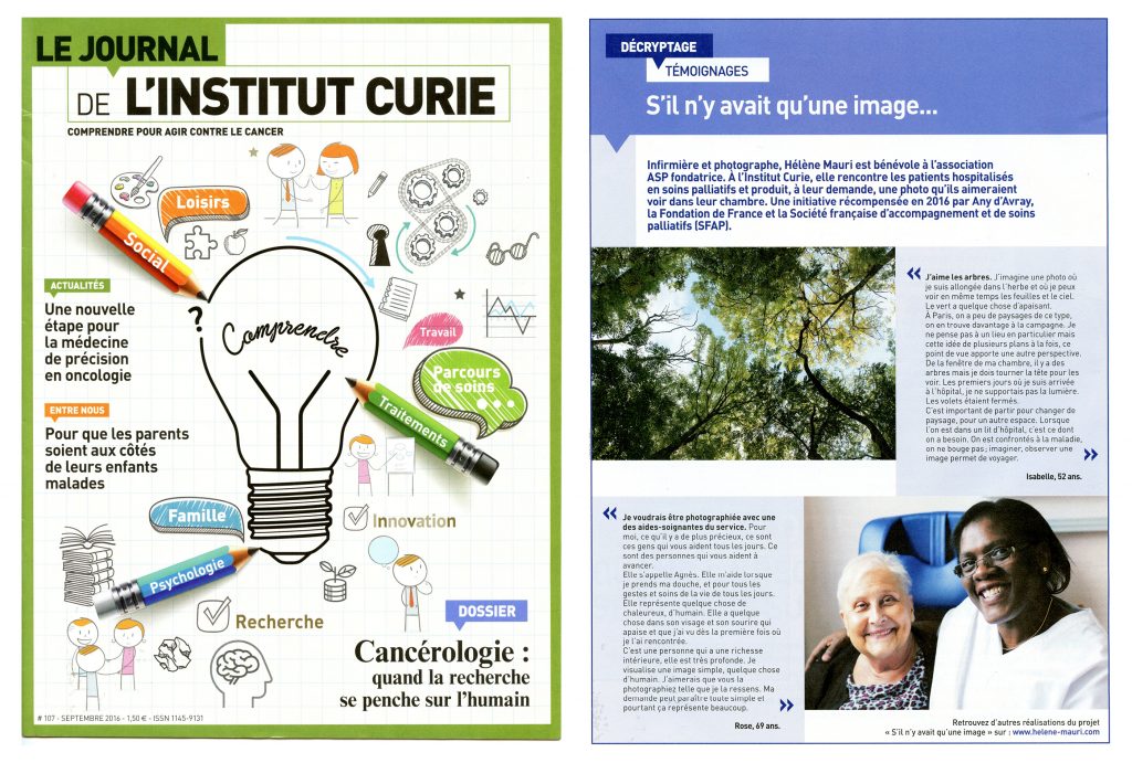 Sandrine Tolotti – « L’image de leur vie » – publié en mars 2021 Fabien Ribéry – « S’il n’y avait qu’une image par Hélène Mauri, photographe, infirmière en soins palliatifs » – publié en février 2021 Fondation de France – « Hélène Mauri : soigner par l’image » – publié le 10 juillet 2020 Vinciane Lacroix – « Hélène Mauri : l’humanité dans sa mission photographique » – publié en septembre 2018 Rose Magazine – « Hélène Mauri, infirmière et photographe » – publié le 17 mai 2018 L’Oeil de la Photographie – « S’il n’y avait qu’une image » – publié en mars 2018 L’Infirmière Magazine n°384 – « L’oeil des patients » – paru en juillet 2017 NEON – « Les Héros de l’Année » – paru en décembre 2016 Le Journal de l’Institut Curie #107 – paru en septembre 2016 Interview pour le Prix Spécial Infirmier Any d’Avray– paru le 24/06/16 Revue InSitu #17 de l’Institut Curie – paru en mai 2016 Site web de l’Institut Curie – paru le 21/03/16